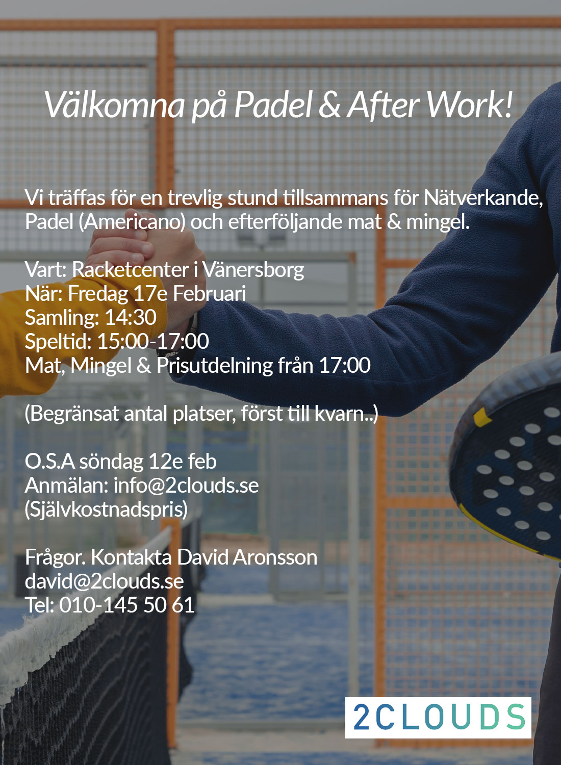 Anmäl dig till Padel & After Work genom att maila mig på info@2clouds eller klicka på länken till vårt kontaktformulär